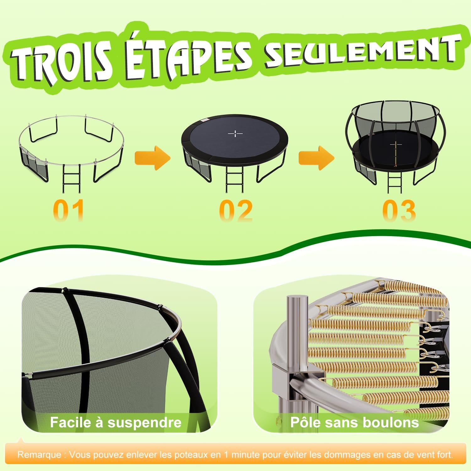 Le trampoline est livré avec une notice claire et des pièces bien emballées. Il faut compter environ 2 heures à deux personnes pour l’installer correctement. Comme pour tous les trampolines de cette taille, la mise en tension du tapis peut demander un peu d’effort, mais tout est bien guidé.