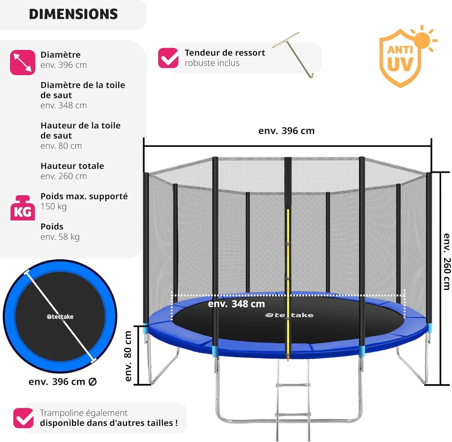 Le trampoline TecTake est conçu pour un usage familial, en extérieur, sur la durée. Il répond aux attentes essentielles : stabilité, confort de saut, et protection renforcée, sans pour autant exploser le budget.